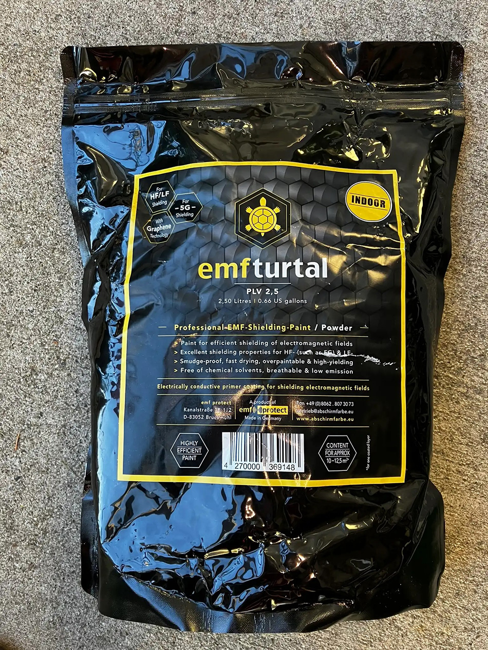 EMF TURTAL Shielding Paint is an electrically conductive primer coating, especially for large area shielding of electromagnetic fields. Because of its electrical conductivity, this product requires grounding by a qualified professional. Always mix and apply paint in a well-ventilated area. Always wear a face mask and eye protection when working with powder or liquid paint.