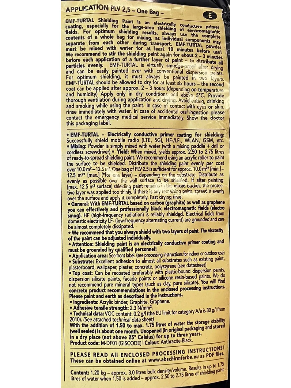| Product Application and Yield | CAUTION: ALWAYS USE A FACE MASK, EYE PROTECTION, AND WORK IN A WELL-VENTILATED AREA WHEN USING POWDER OR LIQUID PAINT. EMF TURTAL Shielding Paint is an electrically conductive primer coating, especially for large area shielding of electromagnetic fields. For optimum shielding results, always use the complete contents of a whole bag for mixing, as individual components may separate from each other during transport. EMF-TURTAL powder must be mixed with water for at least 10 minutes before use! We recommend stirring the shielding paint again for about 2 to 3 minutes before each application of a further layer of paint to distribute all particles evenly. EMF-TURTAL is virtually smudge-proof after drying and can be easily painted over with conventional dispersion paints. For optimum shielding, it must always be painted in 2 layers. EMF-TURTAL should be allowed to dry for at least 6 hours –the second coat can be applied after approximately 2 to 3 hours (depending on temperature and humidity). Apply only in dry conditions and above 41°F (5°C). Provide thorough ventilation during application and drying. Avoid eating, drinking, and smoking while using the paint. In case of contact with eyes or skin, rinse immediately with water. In case of accidental oral ingestion please contact the emergency medical service immediately. Show the doctor the packaging label. NOTE – Depending on the thickness of the liquid paint, one bag of powdered paint mixed with 0.5 gallons (2 liters) of water yields approximately 0.66 to 0.73 gallons (2.5 to 2,75 liters) of ready-to-use shielding paint, enough to cover an area approximately 134.5 sq ft (12.5m²) with one layer. The amount of water added may vary depending on surface absorption. Add water slowly, mixing as you add until you reach a thick, fully blended consistency. Desired consistency will depend on the surface the paint is applied to. Remix paint occasionally to ensure heavier material is not settled to the bottom of the mixing vessel. EMF-TURTAL – Electrically conductive primer coating for shielding: Successfully shield mobile radio (LTE, 5G), HF-/LF-, WLAN, GSM, etc. With the addition of 1.50 to max. 1.75 liters of water the storage stability (well sealed) is about one month. Unopened (in original packaging and stored in a dry place (not above 25° Celsius) for up to three years. Product code: M-DF01 (GI5CODE), Color: Anthracite-Black. PLEASE READ ALL PROCESSING INSTRUCTIONS! Content: 2.65 lbs (1.20 kg) – yields approximately 0.66 to 0.73 gallons (2.50 to 2.75 liters) of shielding paint. |